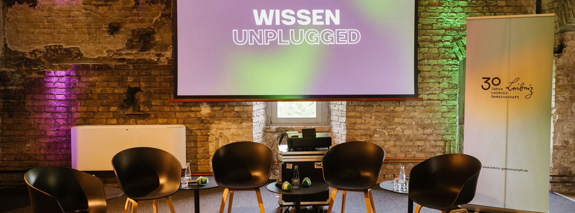 Fünf Stühle stehen vor einer Leinwand. Auf der Leinwand steht "Wissen Unplugged". Der Raum ist eine alte Ruine die renoviert worden ist als Veranstaltungslocation.