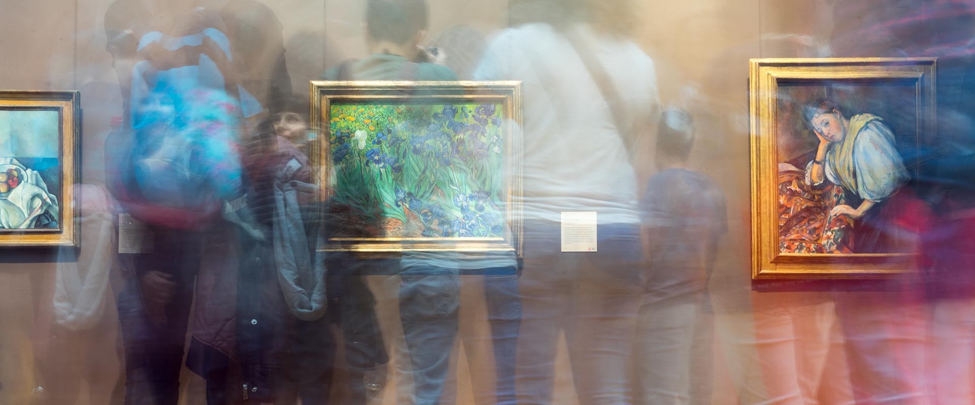 Double-exposure shadows of people in a gallery space with impressionist paintings